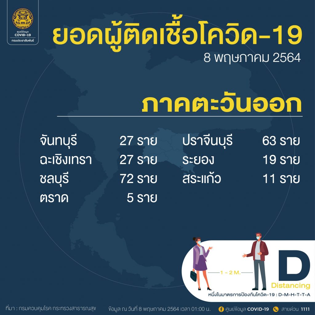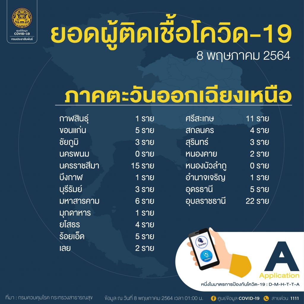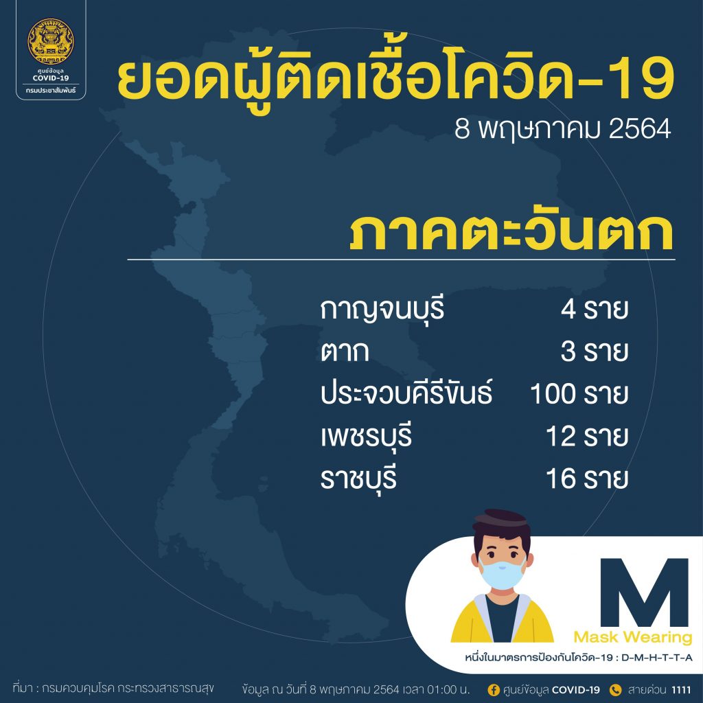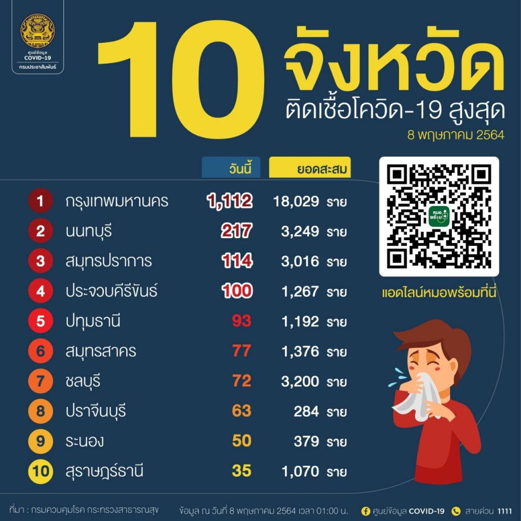 เมื่อวันที่ 8 พฤษภาคม ศูนย์ข้อมูลโควิด-19 กรมประชาสัมพันธ์ รายงานตัวเลขผู้ติดเชื้อโควิด-19 สูงสุด ประจำวันที่ 8 พฤษภาคม โดยอันดับ 1 ยังเป็นกรุงเทพมหานคร ที่มีผู้ติดเชื้อใหม่ 1,112 ราย มียอดสะสม 18,029 ราย อันดับ 2 นนทบุรี จำนวน 217 ราย สะสม 3,249 ราย อันดับ 3 สมุทรปราการ 114 ราย และ 4.ประจวบคีรีขันธ์ 100 ราย