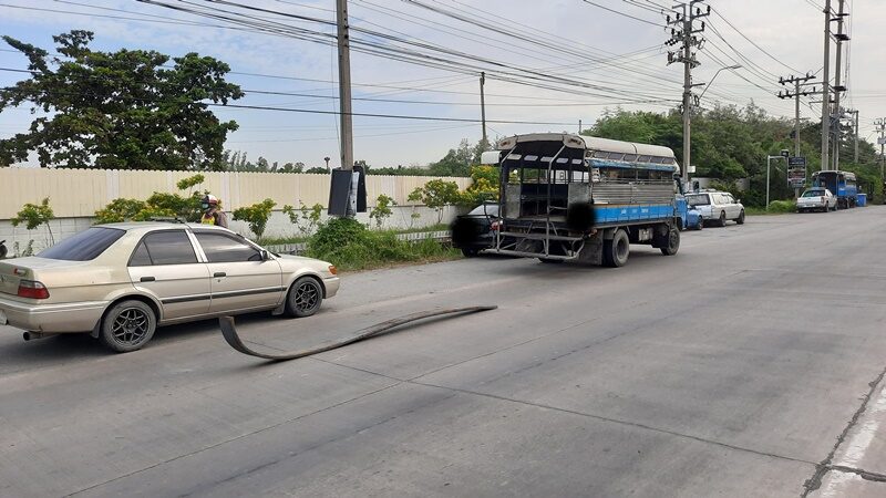 ผู้โดยสารโดดหนีตาย เหล็กเกี่ยวรถสองแถว ร่วงจากรถบรรทุกกระแทกพื้นถนน จยย.ตามหลัง เบรกไม่ทัน ล้มเจ็บ1
