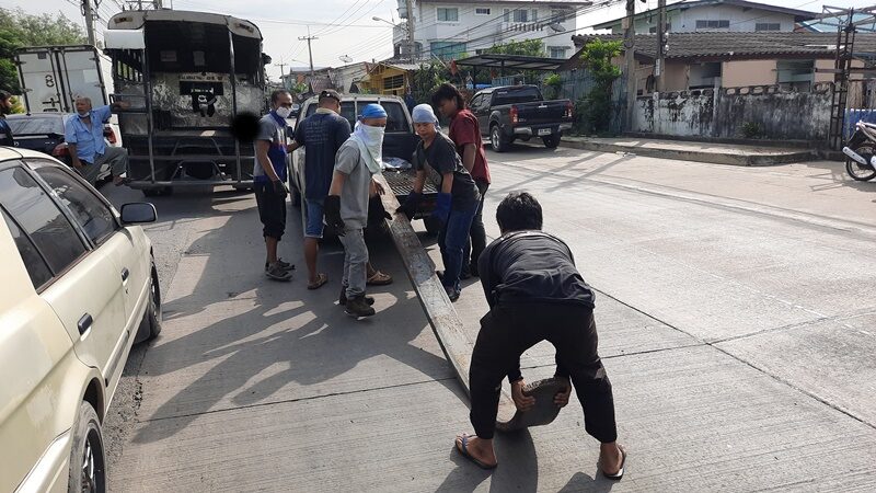 ที่เกิดเหตุพบเหล็กแผ่นยาวแบบเหล็กตันน้ำหนักกว่า 500 กิโลกรัม กว้าง 1 ฟุต ยาวกว่า 5 เมตร หล่นอยู่กลางถนน ห่างกันเล็กน้อยพบรถยนต์สองแถวโดยสารวิ่งระหว่างท่าน้ำพระสมุทรเจดีย์-วัดแหลมฟ้าผ่า อีซูซุ สีฟ้า ทะเบียน 10-1324 สมุทรปราการ จอดชิดขอบทางด้านซ้าย สภาพขอบและโครงหลังคาด้านขวาถูกเหล็กกระแทกเสียหาย ถัดกันเล็กน้อยพบรถจักรยานยนต์ ฮอนด้าดรีม สีน้ำตาล-ขาว ทะเบียน4กท4683กทม. ล้มตะแคงอยู่บนพื้นถนนมีผู้ได้รับบาดเจ็บเป็นหญิง 1 ราย