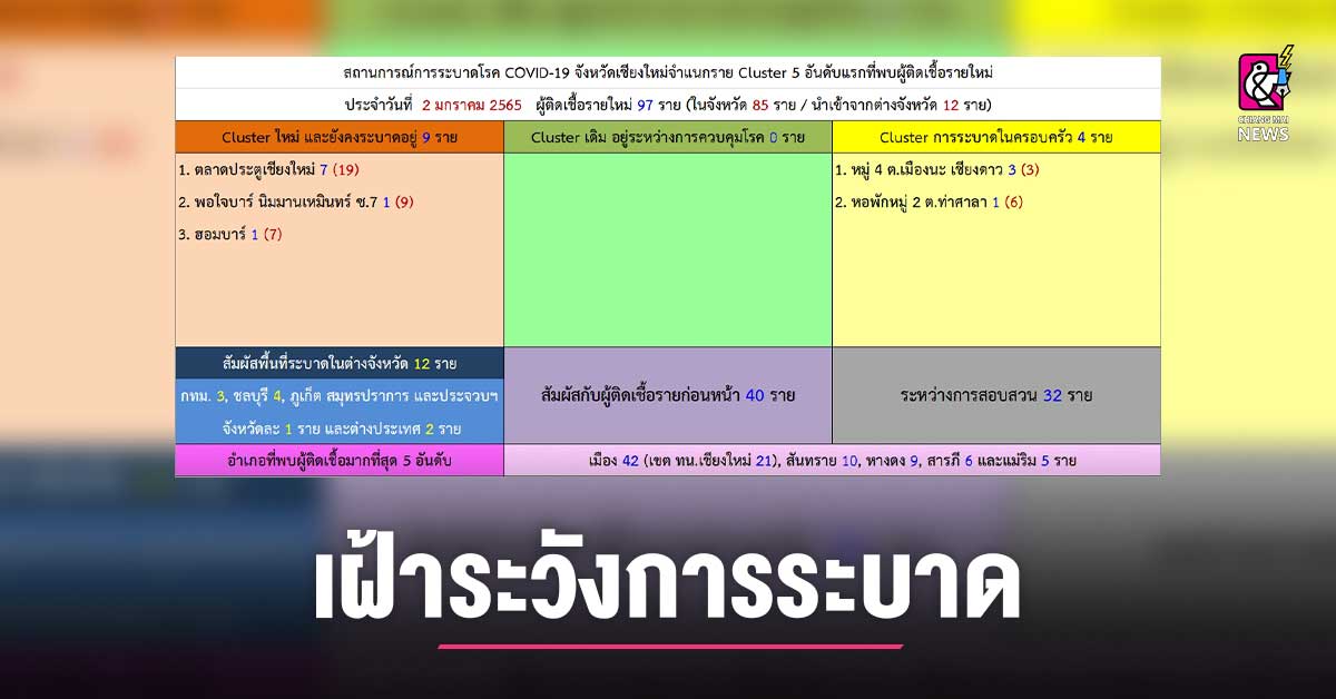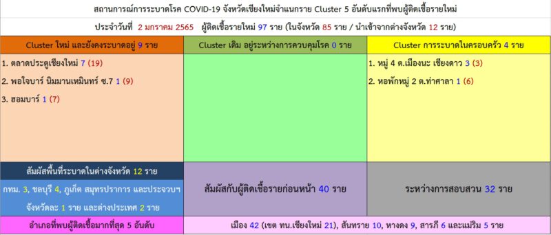 สถานการณ์การแพร่ระบาดของโรคโควิด-19 จังหวัดเชียงใหม่ วันนี้ (2 ม.ค. 65) มีผู้ติดเชื้อรายใหม่ 97 ราย โดยเป็นผู้ติดเชื้อที่เดินทางมาจากต่างพื้นที่ 12 ราย ได้แก่ กรุงเทพมหานคร 3 ราย, ชลบุรี 4 ราย, ภูเก็ต สมุทรปราการ และประจวบคีรีขันธ์ จังหวัดละ 1 ราย และนักท่องเที่ยวจากต่างประเทศ ซึ่งเดินทางเข้ามาแบบ Test & Go อีก 2 ราย อีก 85 ราย เป็นผู้ติดเชื้อในจังหวัด โดยมาจากคลัสเตอร์ใหม่ และคลัสเตอร์ที่ยังมีการระบาดอย่างต่อเนื่อง 9 ราย ประกอบด้วย คลัสเตอร์ตลาดประตูเชียงใหม่ 7 ราย, คลัสเตอร์พอใจบาร์ นิมมานเหมินทร์ ซอย 7 จำนวน 1 ราย และคลัสเตอร์ฮอมบาร์ 1 ราย ขณะนี้ทีมควบคุมโรคในทุกพื้นที่ได้ลงทำการควบคุมโรค ตรวจคัดกรองเชิงรุกแยกกลุ่มเสี่ยงสูง กลุ่มเสี่ยงต่ำ ฆ่าเชื้อในพื้นที่ และสอบสวนโรคแล้ว ส่วนคลัสเตอร์เดิมที่อยู่ระหว่างการควบคุมโรค การออกตรวจเชิงรุก และการติดตามผู้สัมผัส ไม่พบผู้ติดเชื้อเพิ่ม