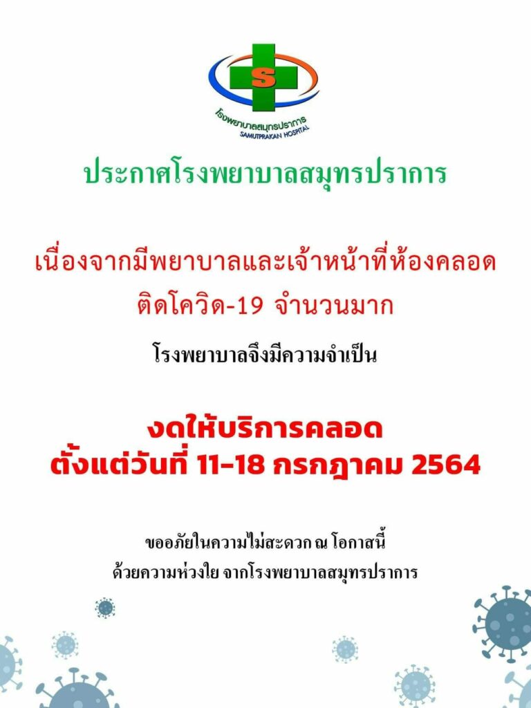 เมื่อวันที่ 11 กรกฎาคม เฟซบุ๊กโรงพยาบาลสมุทรปราการ เผยแพร่ประการแจ้งปิดห้องคลอด ตั้งแต่วันนี้-18 กรกฎาคม เนื่องจากพยาบาลและเจ้าหน้าที่ห้องคลอดติดเชื้อไวรัสโควิด 19 เป็นจำนวนมาก โดยมีผู้ใช้เฟซบุ๊กเข้าไปให้กำลังใจบุคลากรทางการแพทย์อย่างล้นหลาม