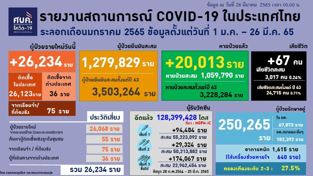 สำหรับประเทศไทยวันนี้พบผู้ติดเชื้อรายใหม่ 26,234 ราย ติดเชื้อในประเทศ 26,123 ราย ติดเชื้อจากต่างประเทศ 36 ราย และจากเรือนจำที่ต้องขัง 115 ราย โดยเป็นผู้ป่วยยืนยันสะสมตั้งแต่ปี 2563 จำนวน 3,503,264 ราย หายป่วย 20,013 ราย โดยผู้ป่วยหายสะสมตั้งแต่ปี 2563 จำนวน 3,228,284 ราย เสียชีวิต 67 ราย โดยเสียชีวิตสะสมตั้งแต่ปี 2563 จำนวน 24,715 ราย ผู้ป่วยรักษาอยู่ 250,265 ราย แบ่งเป็น อยู่ในโรงพยาบาล 67,873 ราย และโรงพยาบาลสนามอื่นๆ 182,392 ราย