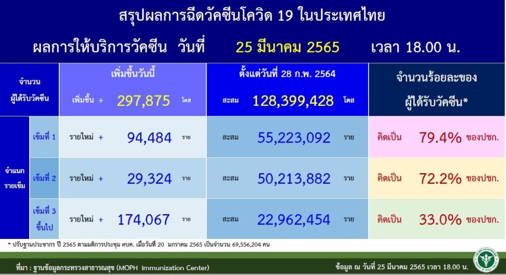 จำนวนผู้ได้รับวัคซีน เข็มที่หนึ่ง เพิ่มขึ้น 94,484 ราย สะสม 55,223,092 ราย คิดเป็น 79.4% ของจำนวนประชากร เข็มที่สอง เพิ่มขึ้น 29,324 ราย สะสม 50,213,882 ราย คิดเป็น 72.2% ของจำนวนประชากร และเข็มสามขึ้นไป เพิ่มขึ้น 174,067 ราย สะสม 22,962,454 ราย 33.0% ของจำนวนประชากร