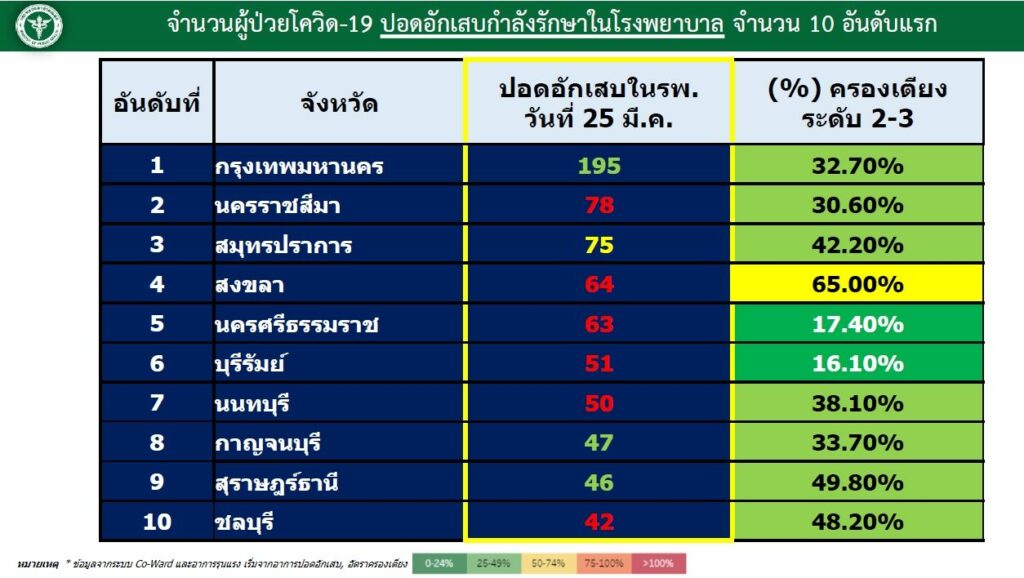 สำหรับผู้ป่วยติดเชื้อมีอาการหนัก 1,615 ราย และใส่เครื่องช่วยหายใจ 640 ราย โดยเมื่อพิจารณาดูจากกราฟตั้งแต่วันที่ 13 มีนาคม จนถึงปัจจุบันพบว่าจำนวนผู้ป่วยปอดอักเสบ และผู้ป่วยที่ต้องใส่ท่อช่วยหายใจกราฟเริ่มปรับระดับสูงขึ้น ซึ่งรายงานระบุถึงผู้ป่วยโควิด-19 ปอดอักเสบกำลังรักษาอยู่ในโรงพยาบาล จำนวน 10 อันดับแรก (วันที่ 25 มีนาคม) ได้แก่ 1) กรุงเทพมหานคร 195 ราย 2) นครราชสีมา 78 ราย 3) สมุทรปราการ 75 ราย 4) สงขลา 64 ราย 5) นครศรีธรรมราช 63 ราย 6) บุรีรัมย์ 51 ราย 7) นนทบุรี 50 ราย 8) กาญจนบุรี 47 ราย 9) สุราษฎร์ธานี 46 ราย และ 10) ชลบุรี 42 ราย
