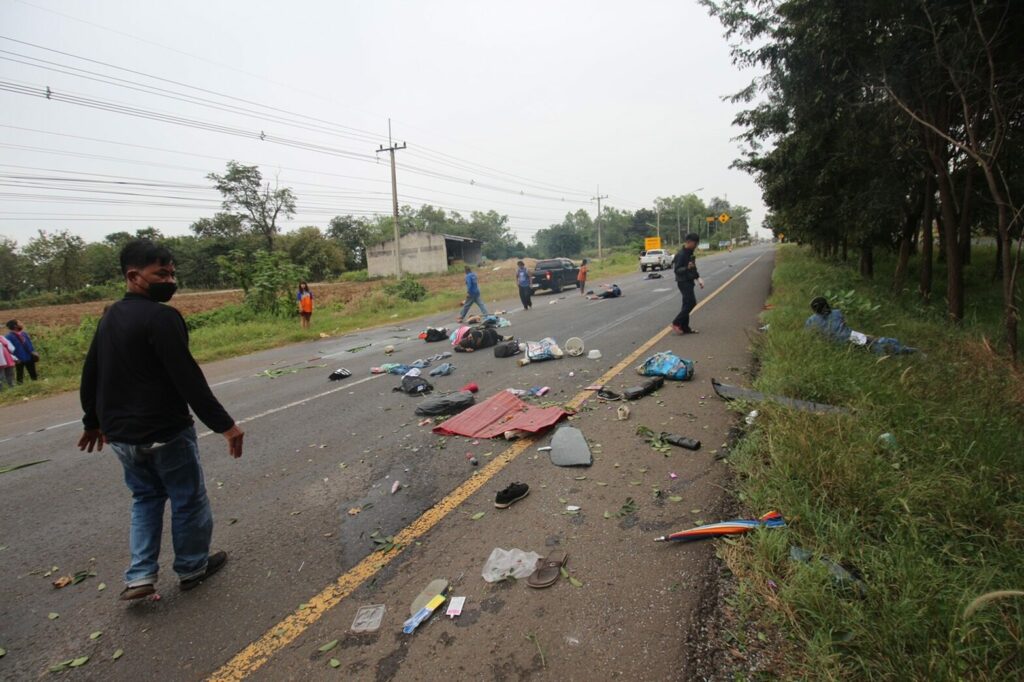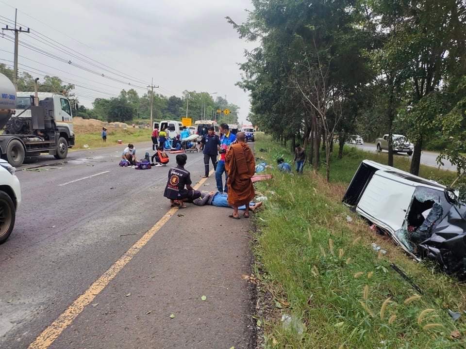 ที่เกิดเหตุเป็นถนนสาย 24 โชคชัย-เดชอุดม ขาเข้า อ.หนองกี่ ก่อนถึงปั๊มน้ำมัน ปตท.พบผู้บาดเจ็บนอนเกลื่อนถนนข้าวของกระจัดกระจายทั่วบริเวณ กู้ภัยตรวจสอบ พบผู้เสียชีวิตในที่เกิดเหตุ 1 ราย ด.ช.เอกชัย คนชุม อายุ 12 ปี