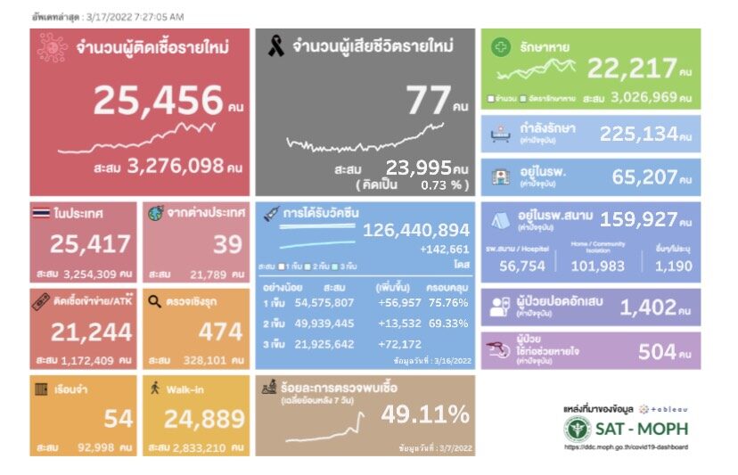 ผู้ป่วยสะสม 1,052,663 ราย (ตั้งแต่ 1 มกราคม 2565) หายป่วยกลับบ้าน 22,217 ราย หายป่วยสะสม 858,475 ราย (ตั้งแต่ 1 มกราคม 2565) ผู้ป่วยกำลังรักษา 225,134 ราย เสียชีวิต 77 ราย