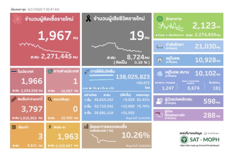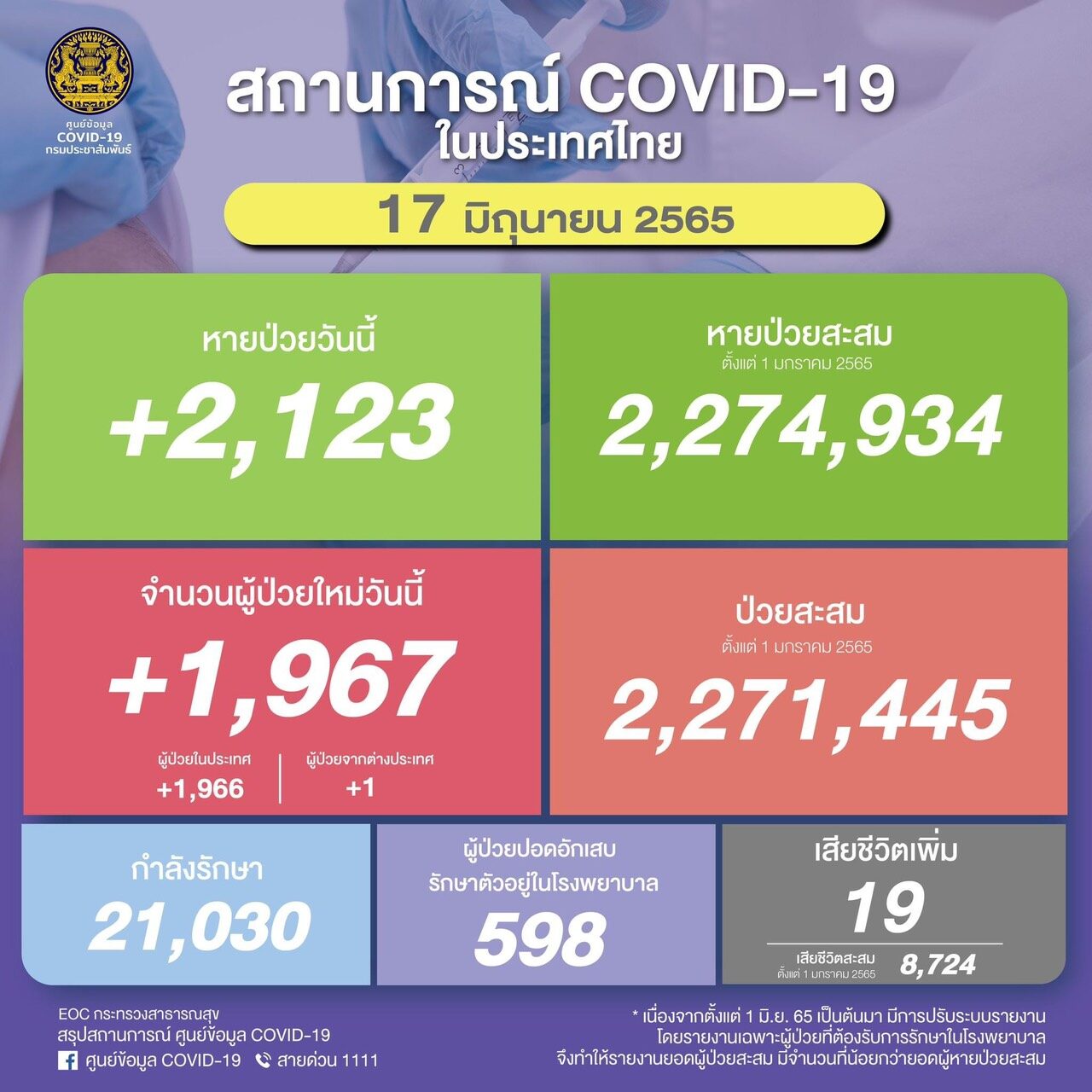 เมื่อวันที่ 17 มิถุนายน สถานการณ์แพร่ระบาดของโควิด-19 ประจำวัน ศูนย์บริหารสถานการณ์การแพร่ระบาดของโรคติดเชื้อไวรัสโคโรนา 2019 หรือ ศบค. รายงานสถานการณ์การแพร่ระบาดของโรคติดเชื้อไวรัสโคโรนา 2019 ป่วยใหม่ จำนวน 1,967 ราย จำแนกเป็น ผู้ป่วยในประเทศ 1,966 ราย ผู้ป่วยมาจากต่างประเทศ 1 ราย ผู้ป่วยสะสม 2,271,445 ราย (ตั้งแต่ 1 มกราคม 2565) หายป่วยกลับบ้าน 2,123 ราย หายป่วยสะสม 2,274,934 ราย (ตั้งแต่ 1 มกราคม 2565) ผู้ป่วยกำลังรักษา 21,030 ราย เสียชีวิต 19 ราย เสียชีวิตสะสม 8,724 ราย (ตั้งแต่ 1 มกราคม 2565) จำนวนผู้ป่วยปอดอักเสบ รักษาตัวอยู่ในโรงพยาบาล 598 ราย